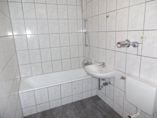 Das Badezimmer, das Gäste-WC und die Küche wurden vor wenigen Jahren mit einem neuen, modernen, grauen Vinylboden ausgestattet. Das Badezimmer hat eine Badewanne und ist an den Wänden weiß gefliest.