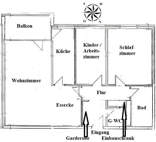 Ca. 87 qm; Aufteilung wie folgt: 1 Wohnzimmer inkl. Essecke + 1 Schlafzimmer + 1 Arbeits-/Kinder-/Gästezimmer + 1 Küche + 1 Diele inkl. Einbauschrank + 1 Badezimmer (Wannenbad) + 1 Gäste-WC + 1 Balkon/Loggia. Die Wohnung liegt im Erdgeschoss, hinten rechts. Aufteilung gemäß beiliegender Grundrisszeichnung.