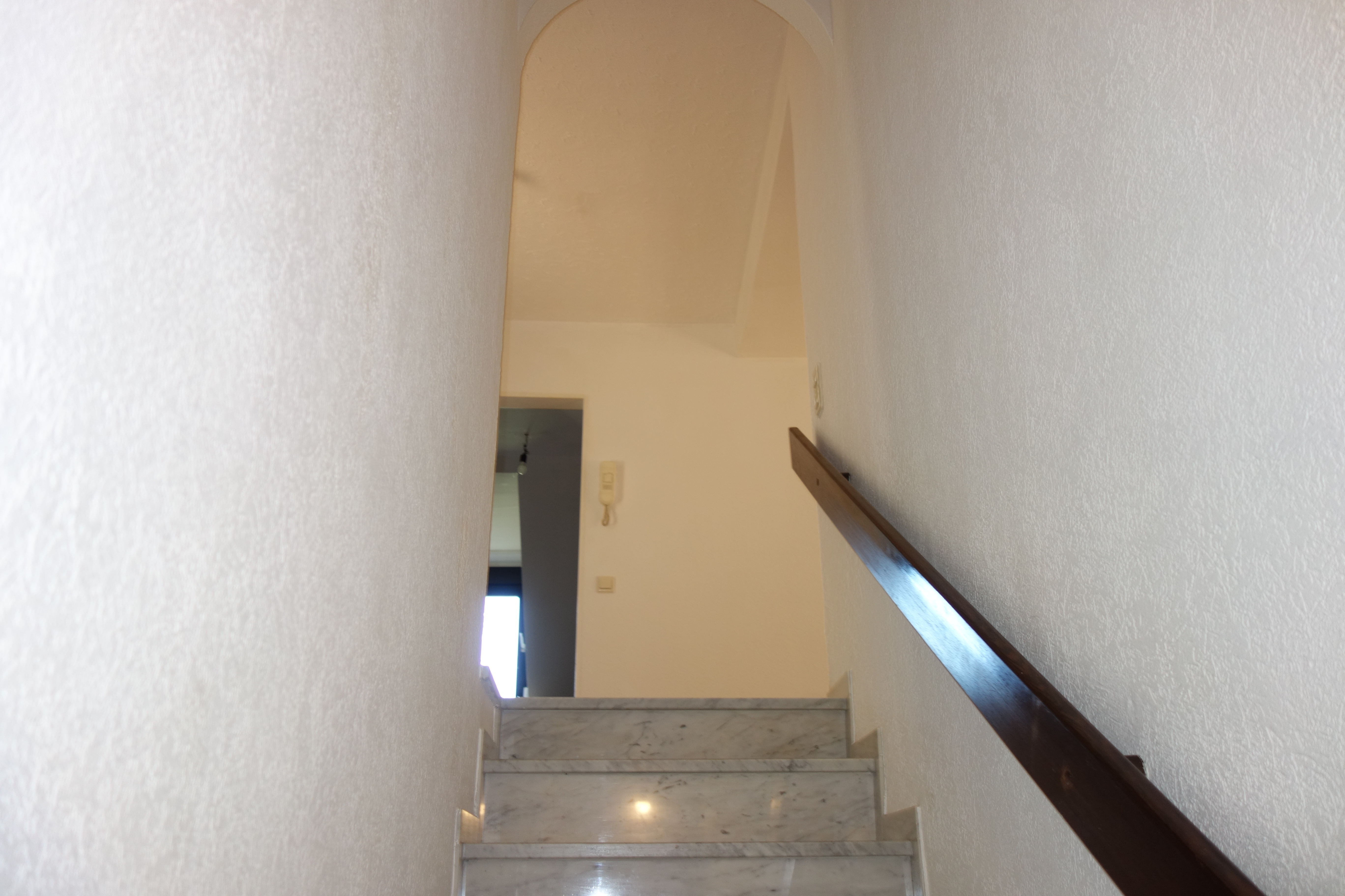 Im Erdgeschoss wurde komplett Marmorboden verlegt, im Kellergeschoss Fliesen sowie Parkett und in der 1. Etage Laminatböden. Die Bäder und die Küchen sind gefliest. Die Wände sind in beiden Einheiten mit Reibeputz, gestrichen versehen. Im Wohnzimmer befindet sich ein Kamin. Bei den Kellerräumen handelt es sich um ausgebaute Räumlichkeiten, unter anderem mit einem kleinen Wellnessbereich (Sauna), zwei Duschbädern, ein Kinderzimmer, ein großer Büroraum, Wasch-/Trockenraum sowie Lagerräume. Die Zugangstreppen zum Keller und zur 1. Etage sind ebenso aus Marmor. In der Wohnung der 1. Etage wurden Außenrollos installiert. Insgesamt hinterlassen beide Wohnungen einen sehr gepflegten Zustand. Die Wohnung in der ersten Etage ist renoviert und auf Wunsch der Käufer kann die Erdgeschosswohnung auch noch renoviert übergeben werden.