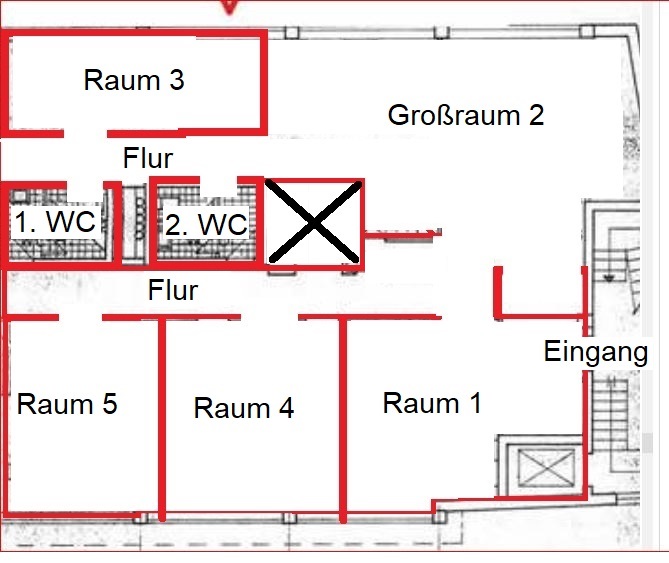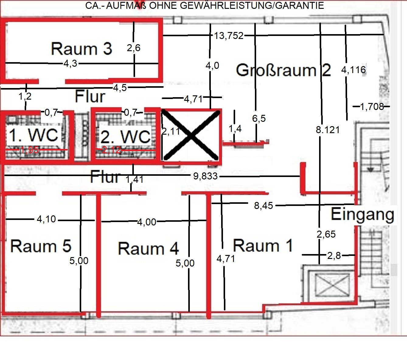 Gesamt derzeit: 5 Büroräume (davon ein großer Konferenzraum inkl Kochnische/Einbauküche) + 2 WC´S + 2 Dielen = ca. 215 qm