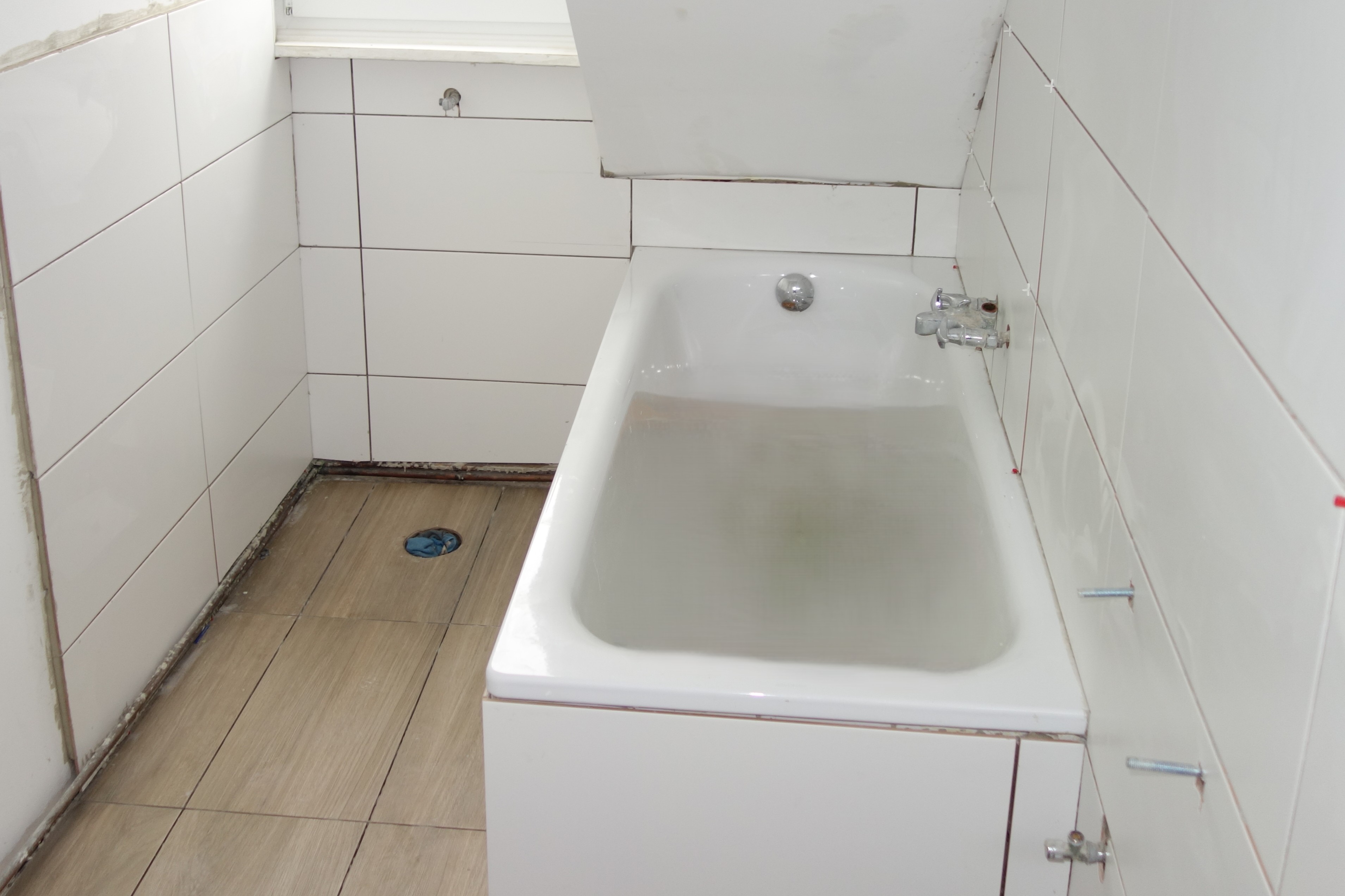 Die Küche und das Badezimmer sind jeweils mit Fenstern ausgestattet. Das Badezimmer hat eine Badewanne und ist an den Wänden modern weiß gefliest, auf dem Boden wurde dunkel-brauner Laminatboden verlegt.