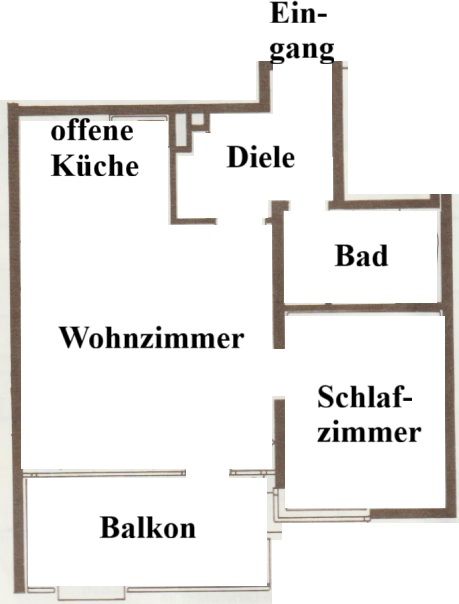 Gesamt: 2 Zimmer + halboffene Küche zum Wohnzimmer + Diele + Bad + Balkon = ca. 50 qm