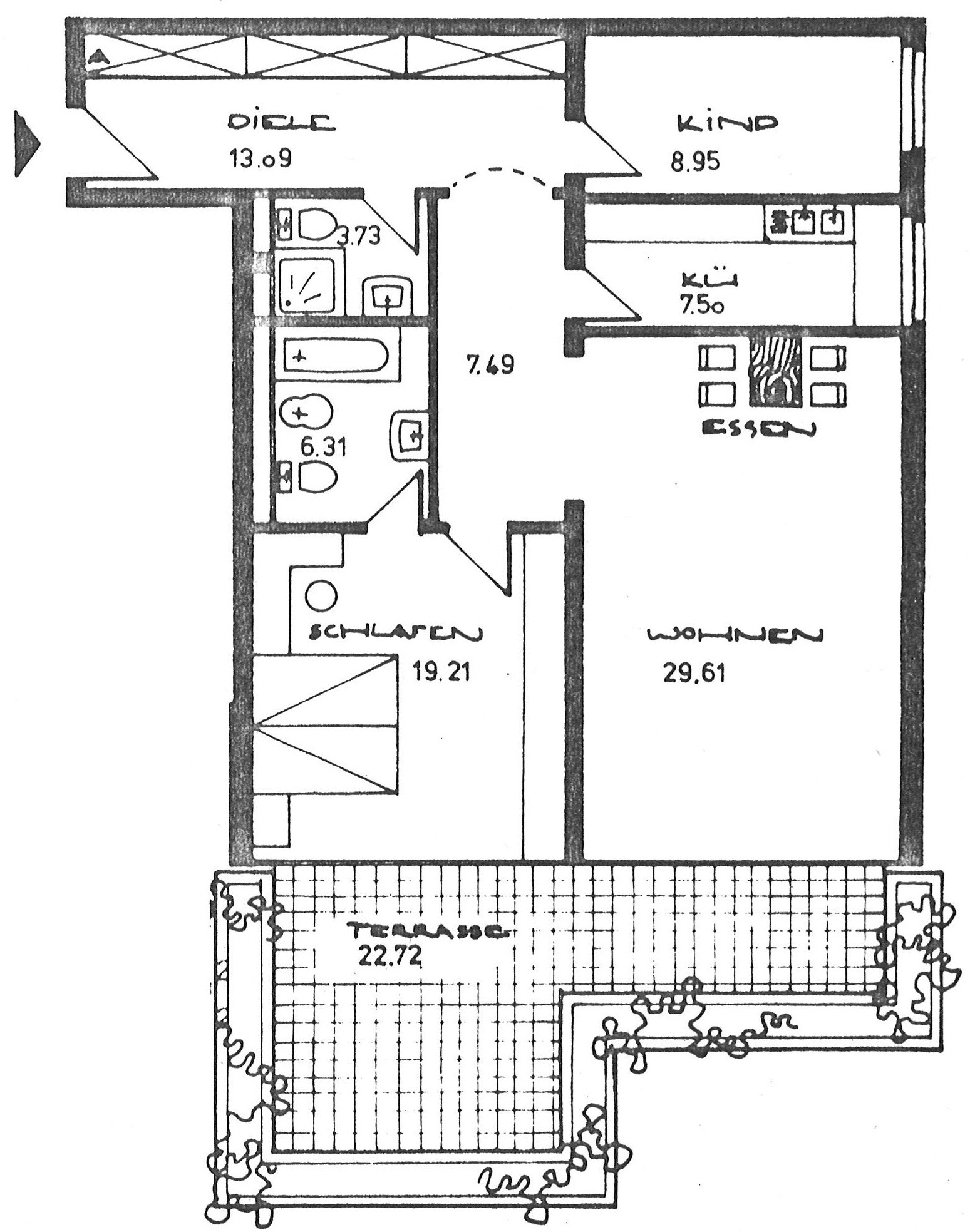Ein geräumiges Wohnzimmer mit Essecke + ein Schlafzimmer + ein Kinderzimmer + eine Küche + zwei Badezimmer + eine Diele + eine Terrasse (knapp 23 qm) = gesamt ca. 100,00 qm
