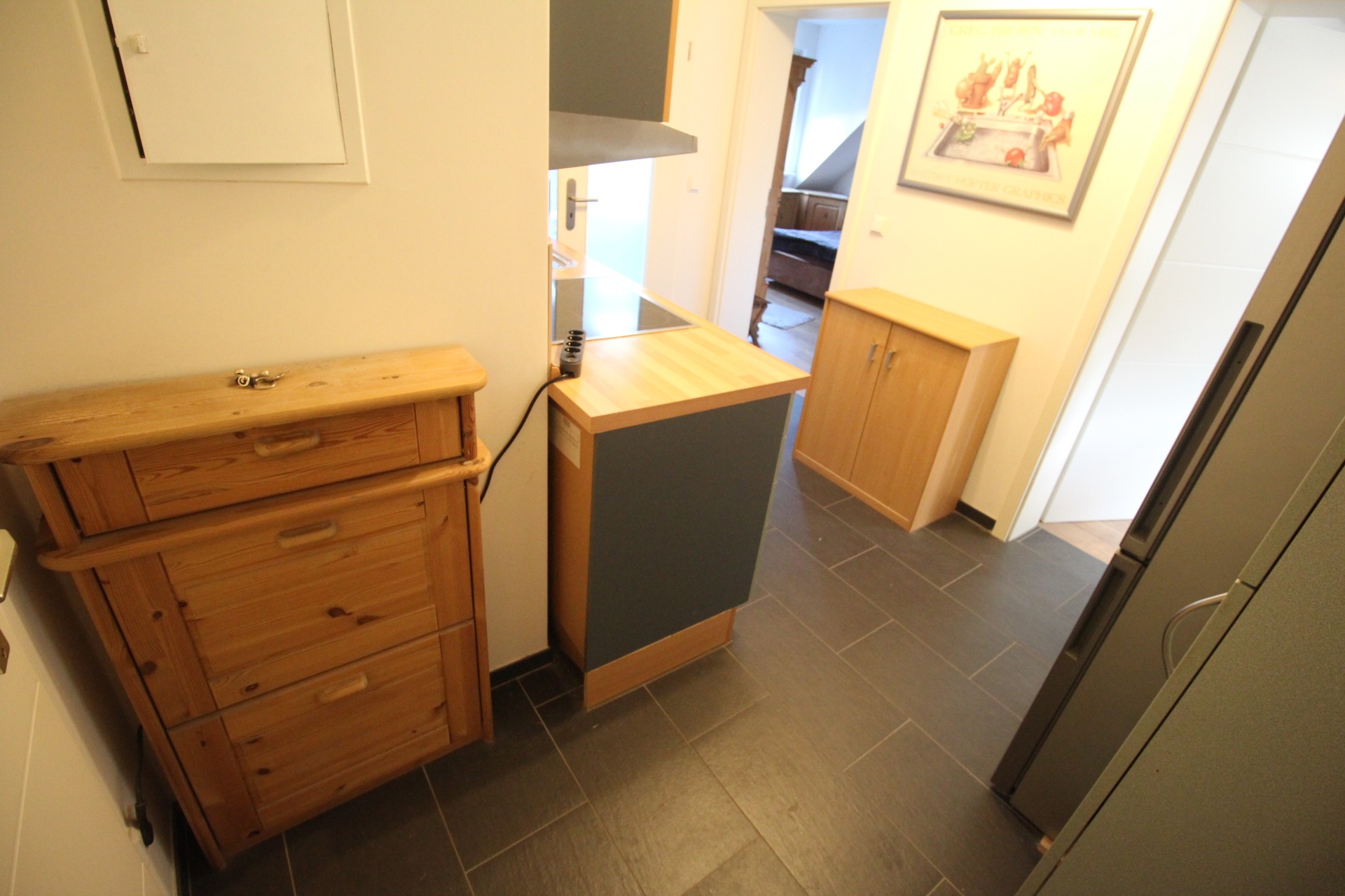 Das sanierte, modern weiß geflieste Badezimmer hat eine Dusche inkl. Duschkabine und ist mit einem Fenster ausgestattet. Der Küchenbereich ist offen in der Diele. Hier befindet sich eine Einbauküche mit Steh-/Hängeschränken, Spülmaschine, Kühlschrank, Gefrierschrank, Herd und Spüle und kann auf Wunsch verbleiben (kostenfrei). Das vorhandene Mobiliar kann ebenso komplett oder teilweise kostenfrei oder eben auch gar nicht gem. Wunsch des neuen Mieters übernommen werden. Im Wohnzimmer und im Schlafzimmer ist Laminatboden verlegt. Die Wohnung ist verfügbar ab sofort oder später gem. Absprache und wird unrenoviert, jedoch in gut erhaltenem Zustand übergeben. Sehr schöne, moderne, ruhige Wohnung, allerdings ohne Balkon und keine separate Küche als Raum.
