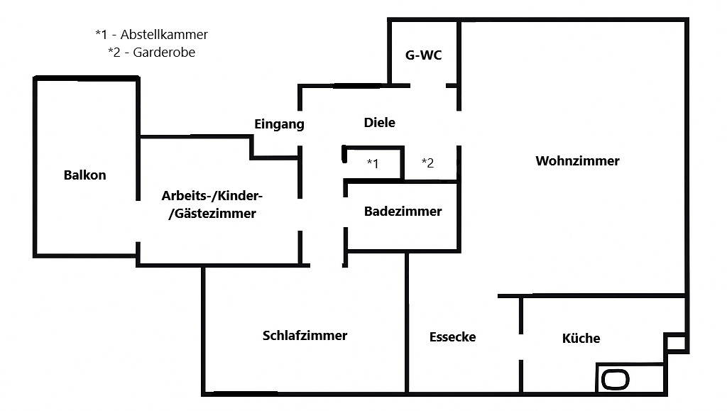 3 Zimmer + Badezimmer + Gäste-WC + Küche + Abstellkammer + Balkon = ca. 87qm