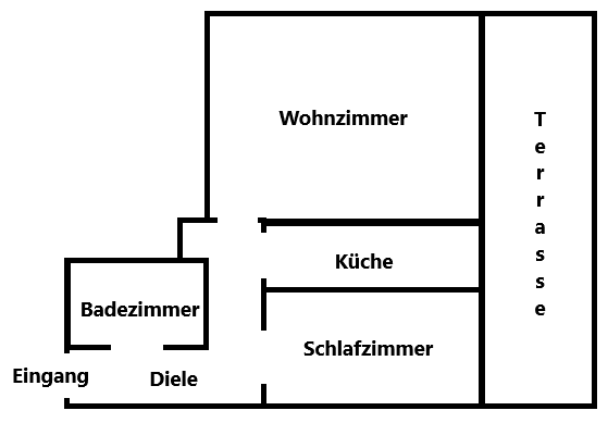 Gesamt: 2 Zimmer + Küche + Diele + Wannenbad + Terrasse = ca. 68,89 m²