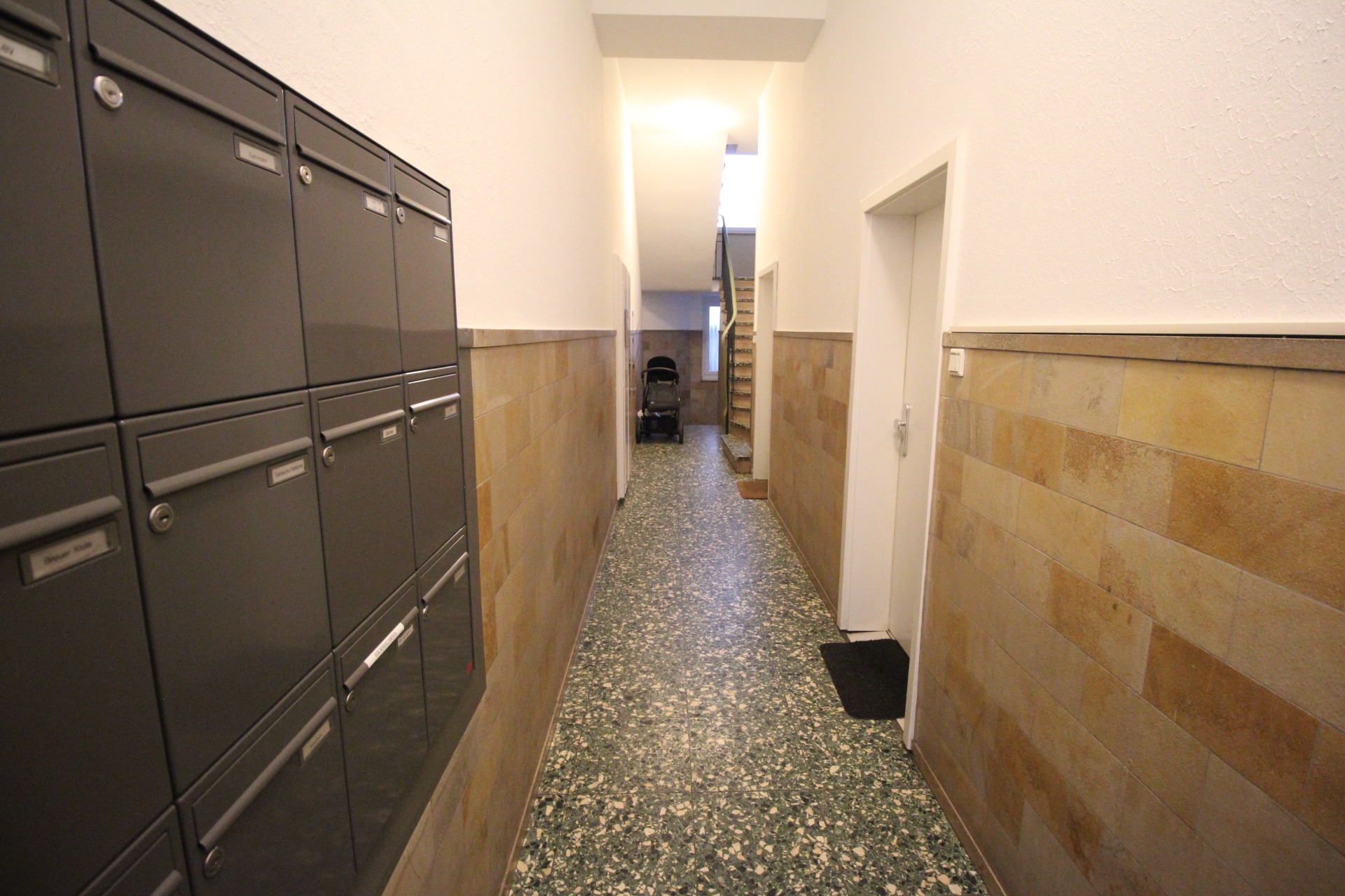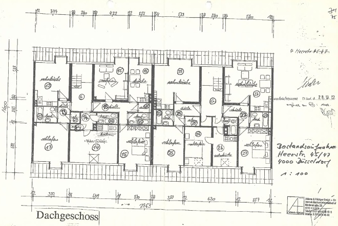 Bei den Ausführungen haben wir auf überschwängliche Beschreibungen verzichtet und uns stattdessen darauf beschränkt, eine möglichst objektive Sichtweise zugrunde zu legen, um einen realitätsnahen ersten Eindruck zu vermitteln. Dies ist erfahrungsgemäß im Interesse aller Beteiligten. Die Wohnung liegt in einem sehr gepflegten 15-Parteien-Mehrfamilienhaus mit Satteldach, 4,5-geschossig. Das Haus wurde 1955 errichtet und befindet sich in einem zeitgemäßen Zustand befindet. Die Eigentümergemeinschaft setzt sich aus insgesamt 2 Häusern zusammen (Heerstr. 45 und 47) auf einem 1006 qm-großen Grundstück mit insgesamt 26 Wohneinheiten, 1 Gewerbeeinheit im Innenhof, 5 Garagen im Innenhof. Die Fassade ist teilweise verputzt/gestrichen und teilweise verklinkert. Das mit Steinbodenplatten ausgelegte Treppenhaus ist im Eingangsbereich kopfhoch gefliest und ansonsten an den Wänden mit Glattputz versehen und gestrichen. Die Fenster sind kunststoffdoppelt isoliert, wobei hier in der zu erwerbende Wohnung ein Dachflächenfenster (doppelverglast) vorliegt. Eine Gegensprechanlage ist vorhanden. Die Wohnung liegt in der vierten (obersten) Etage im Dachgeschoss. Ein Aufzug ist nicht vorhanden. Als Heizsystem wurde eine Gas-Zentral-Heizung. Die Warmwasserversorgung erfolgt über Durchlauferhitzer. Zu der Wohnung gehört ein eigenes Kellerabtei.