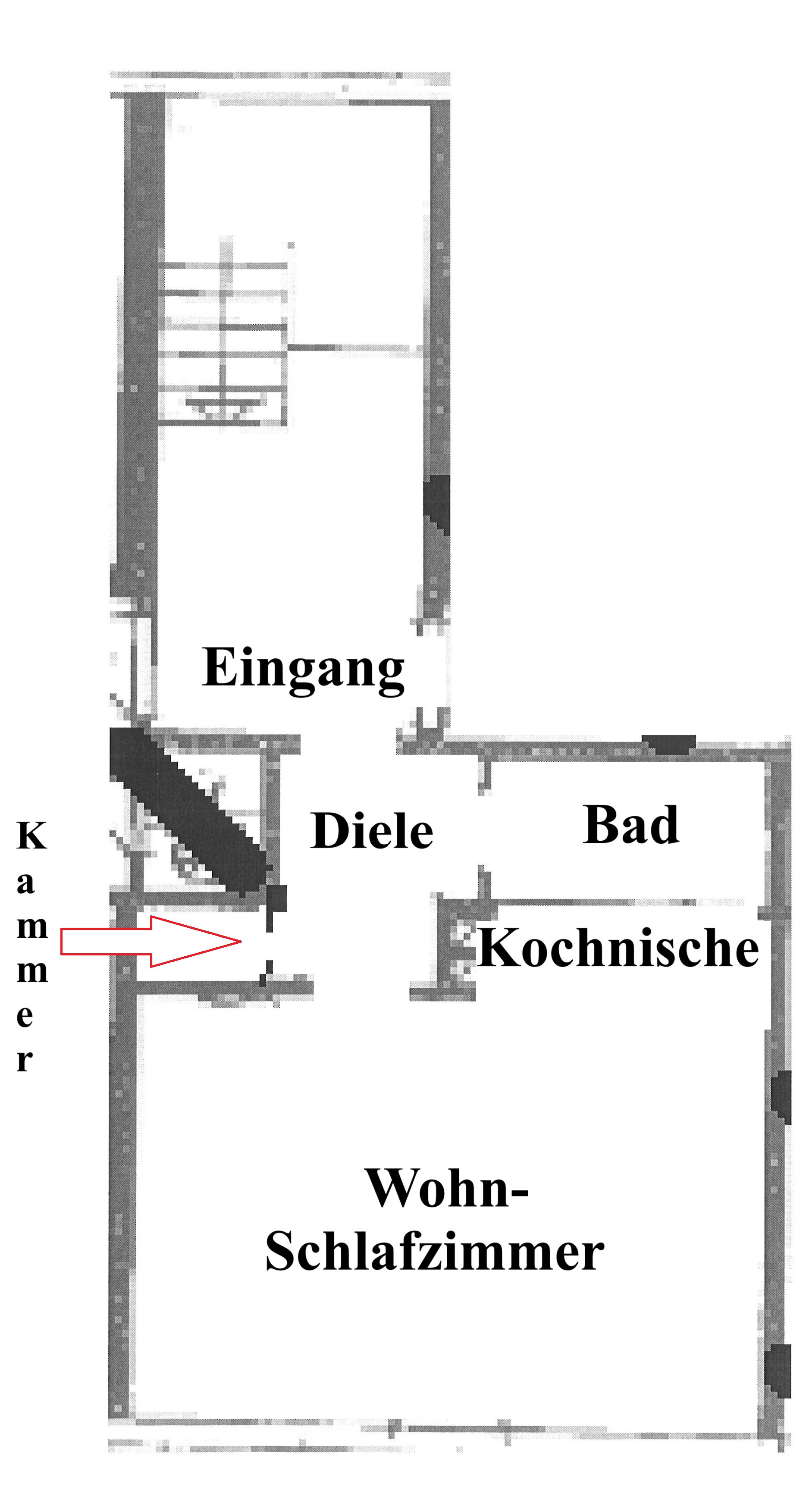 Ein geräumiges Wohn-/Ess-/Schlafzimmer mit offener Kochnische + ein Badezimmer + eine Diele + 1 Abstellkammer = gesamt ca. 31,00 qm