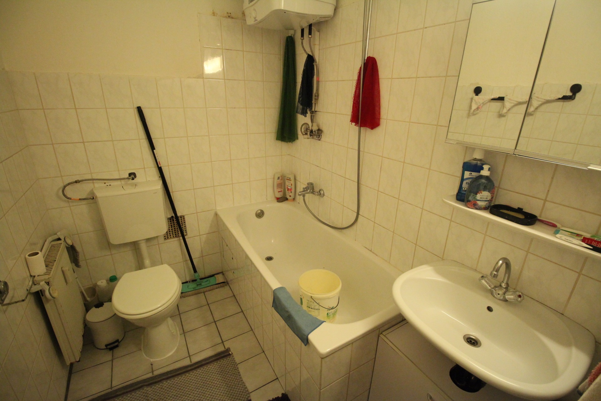 Das Badezimmer (mit Badewanne) ist weiß gefliest/gekachelt. Die restlichen Räumlichkeiten sind komplett mit Laminat ausgelegt. Die Wände sind tapeziert/gestrichen und zur Straßenseite mit Holzpaneelen verkleidet. Zu dieser Wohnung gehört kein PKW-Stellplatz. Insgesamt hinterlässt die Wohnung einen gepflegten Eindruck und ist mit einem normalen Ausstattungsniveau anzusehen, was in der Kaufpreisfindung bereits berücksichtigt wurde.