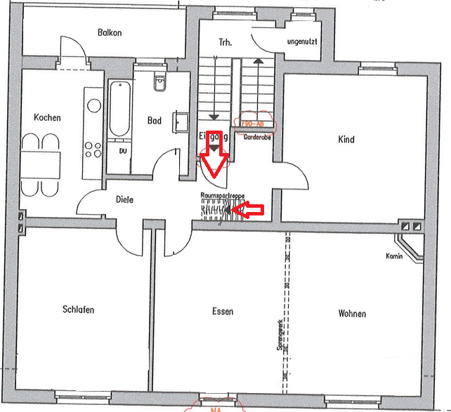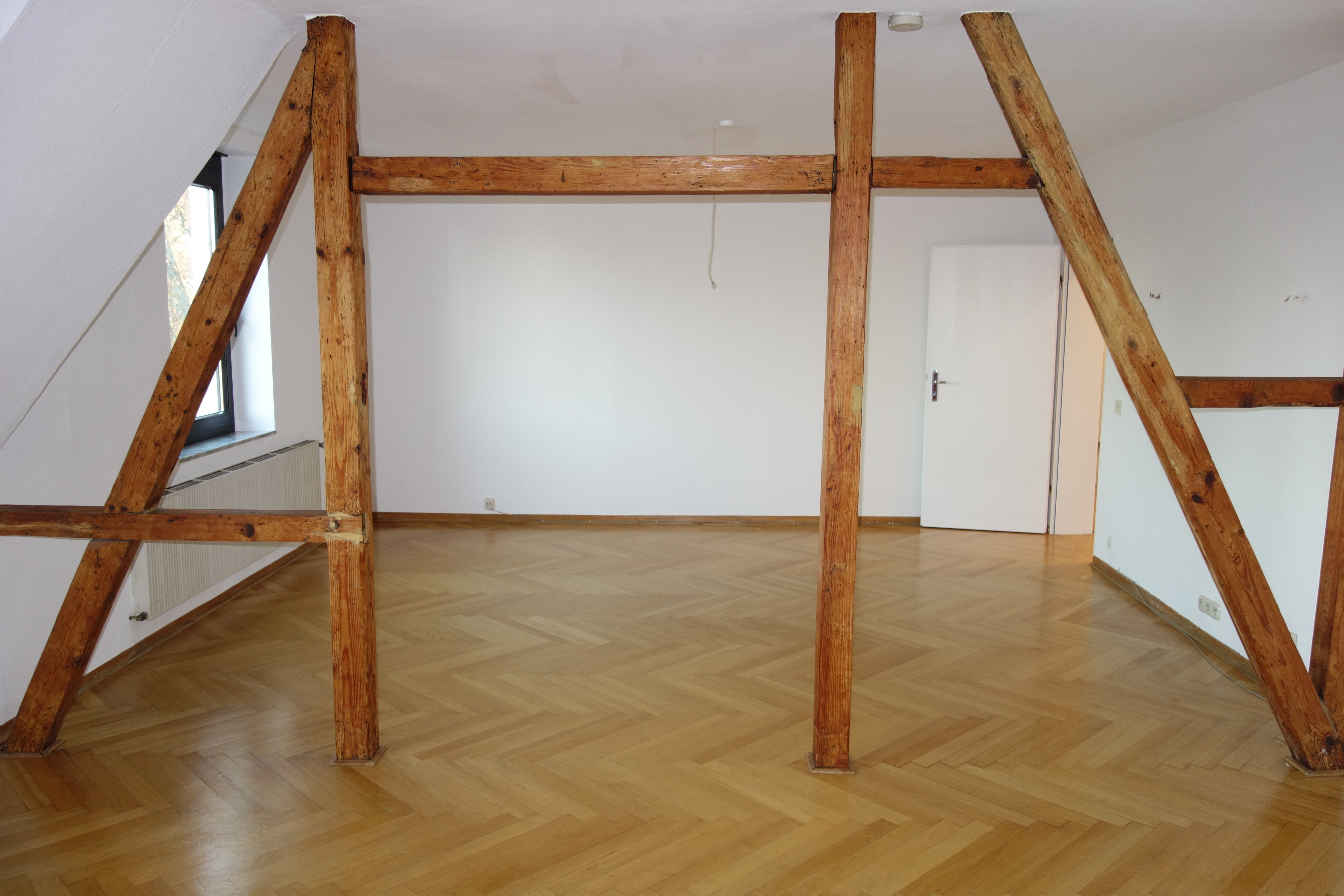 Das Badezimmer wurde nach einem Wasserschaden teilsaniert, verfügt über ein Fenster, eine Badewanne sowie eine separate Duschkabine und ist teilweise neu, modern gefliest. Ansonsten ist die dritte Etage komplett mit Parkettboden und das Dachgeschoss mit Laminatböden ausgelegt. Markant im Wohnzimmer sind die sowohl quer eingebauten Holzbalken als auch ein offener Kamin. Eine vorhandene Einbauküche aus 2021 in der großen Wohnküche, die Platz für Tisch und Stühle bietet, kann bei Bedarf für V. B. 5.000,00 € mit übernommen werden. Der große West-Balkon wurde 2022 saniert, ist gefliest und geht von der Küche ab. Die Elektrik ist teilweise erneuert worden durch einen neuen Sicherungskasten und neuen Leitungen in der Diele und in der Küche. In der Küche und in der Diele sind Downlights installiert. Das WC im Spitzboden ist von beiden Räumen separat begehbar. Eine Gegensprechanlage ist vorhanden. Die Heizkörper sind noch aus den achtziger Jahren. Derzeit ist der Spitzboden nicht beheizt, wobei hier entweder Elektroheizkörper aufgestellt werden können oder sogar über die Gastherme vom Badezimmer aus Leitungen nach oben verlegt werden könnten. Eine Teilerneuerung der Elektrik in der Hauptwohnung ist empfehlenswert. Es handelt sich hier zwar um eine Altbauwohnung, jedoch nicht mit typisch hohen Decken (hier: Höhe ca. 2,75 m).