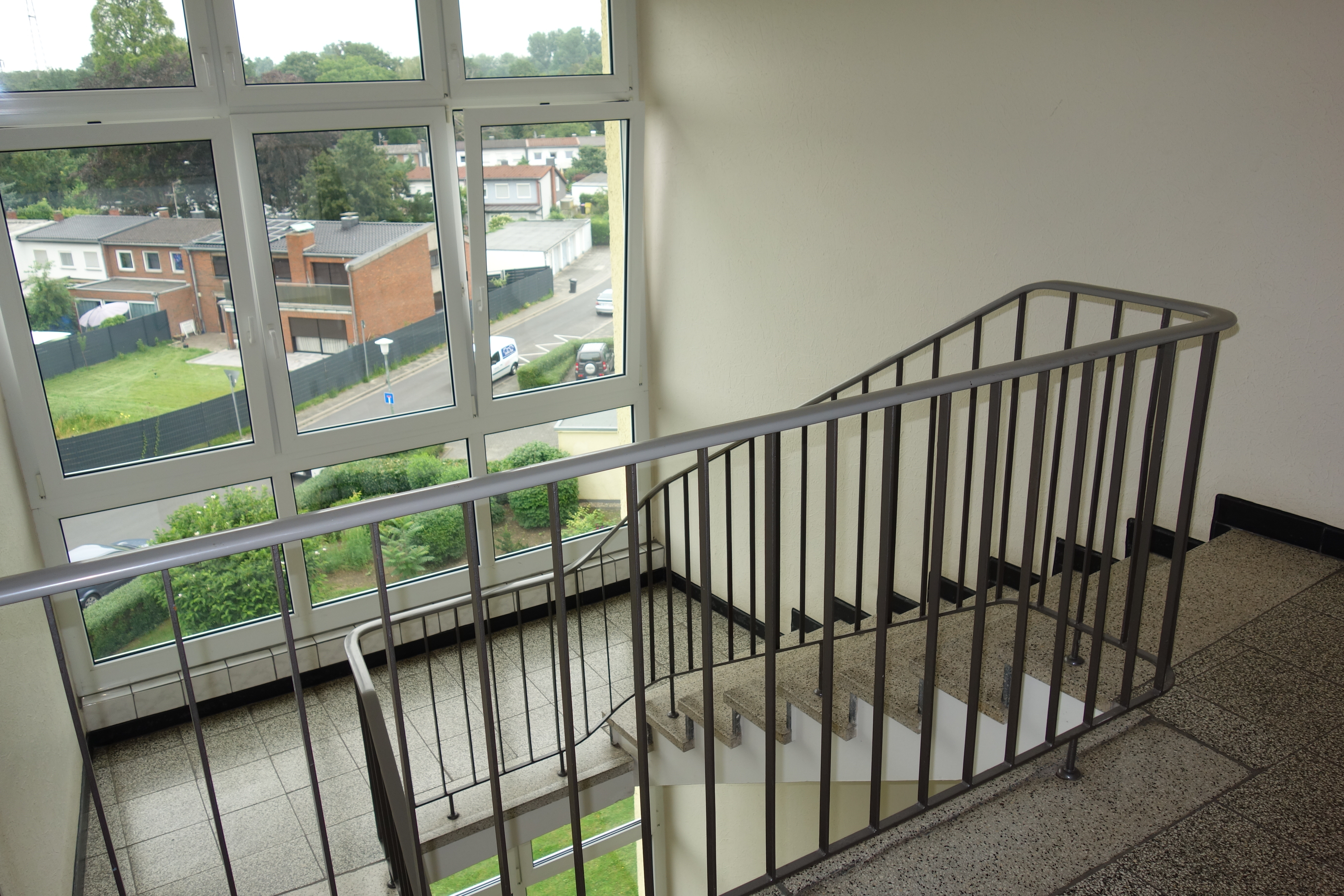 Das Marmorboden-Treppenhaus ist an den Wänden weiß verputzt/gestrichen. Zugang zu den Wohnungen erhält man über einen Laubengang. Das Haus verfügt über ein Flachdach. Die Aluminiumfenster sowie die Balkontür sind doppelt isoliert. Es liegt eine Gas-Zentral-Heizung sowie eine zentrale Warmwasserversorgung vor. Das Haus verfügt über keinen Aufzug.