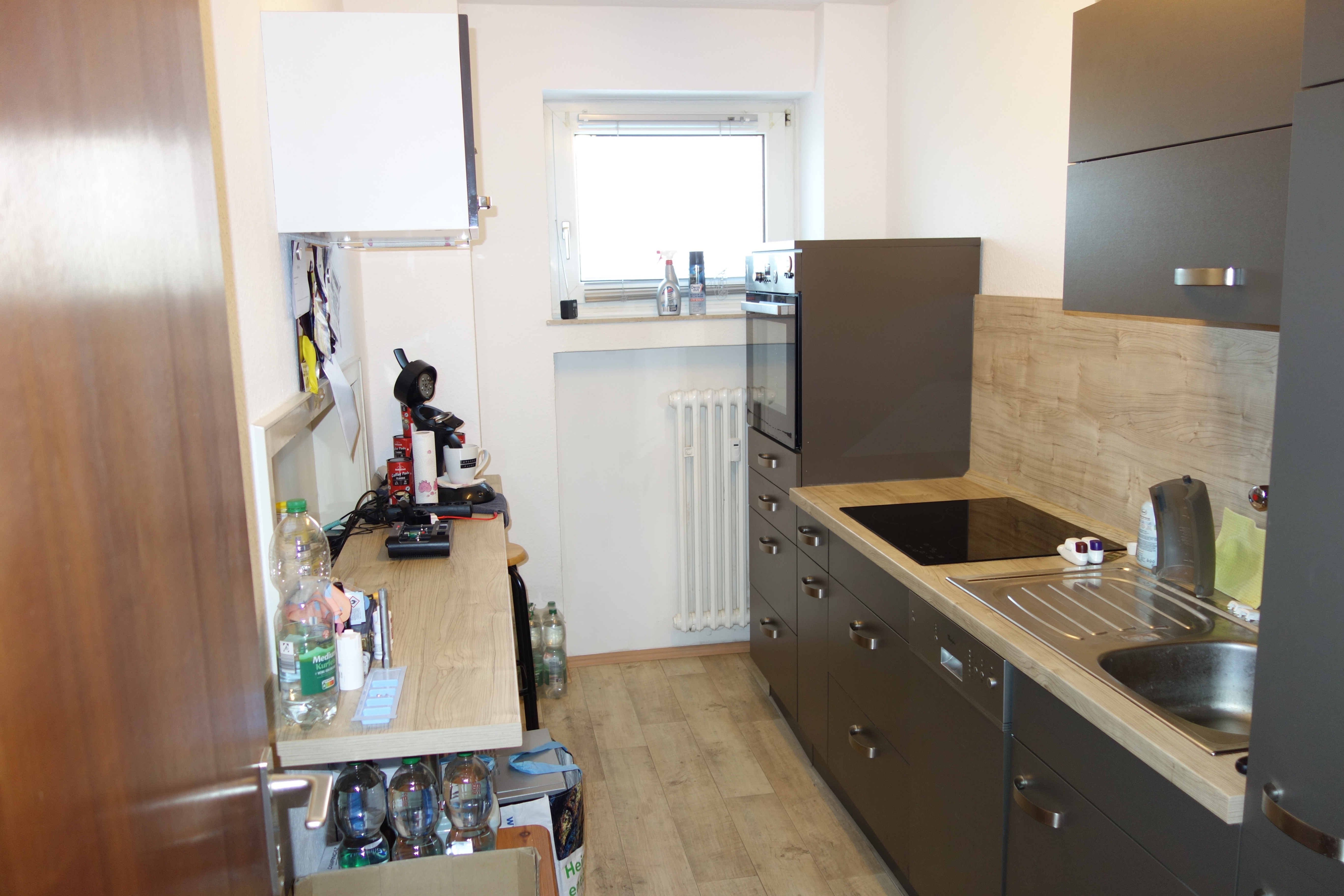 Eine vorhandene Einbauküche (inkl. Ober-/Unterschränke, Spüle, Dunstabzugshaube, Herd / Ofen, Kühlschrank inkl. Gefrierfach, Theke mit Barhockern) kann, muss aber natürlich nicht, vom Vormieter für 500,00€ V.B. übernommen werden.
