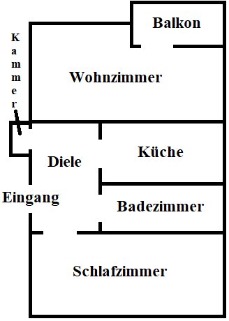 Gesamt: 2 Zimmer + Küche + Diele + Bad + Balkon + Abstellkammer = ca. 58 qm