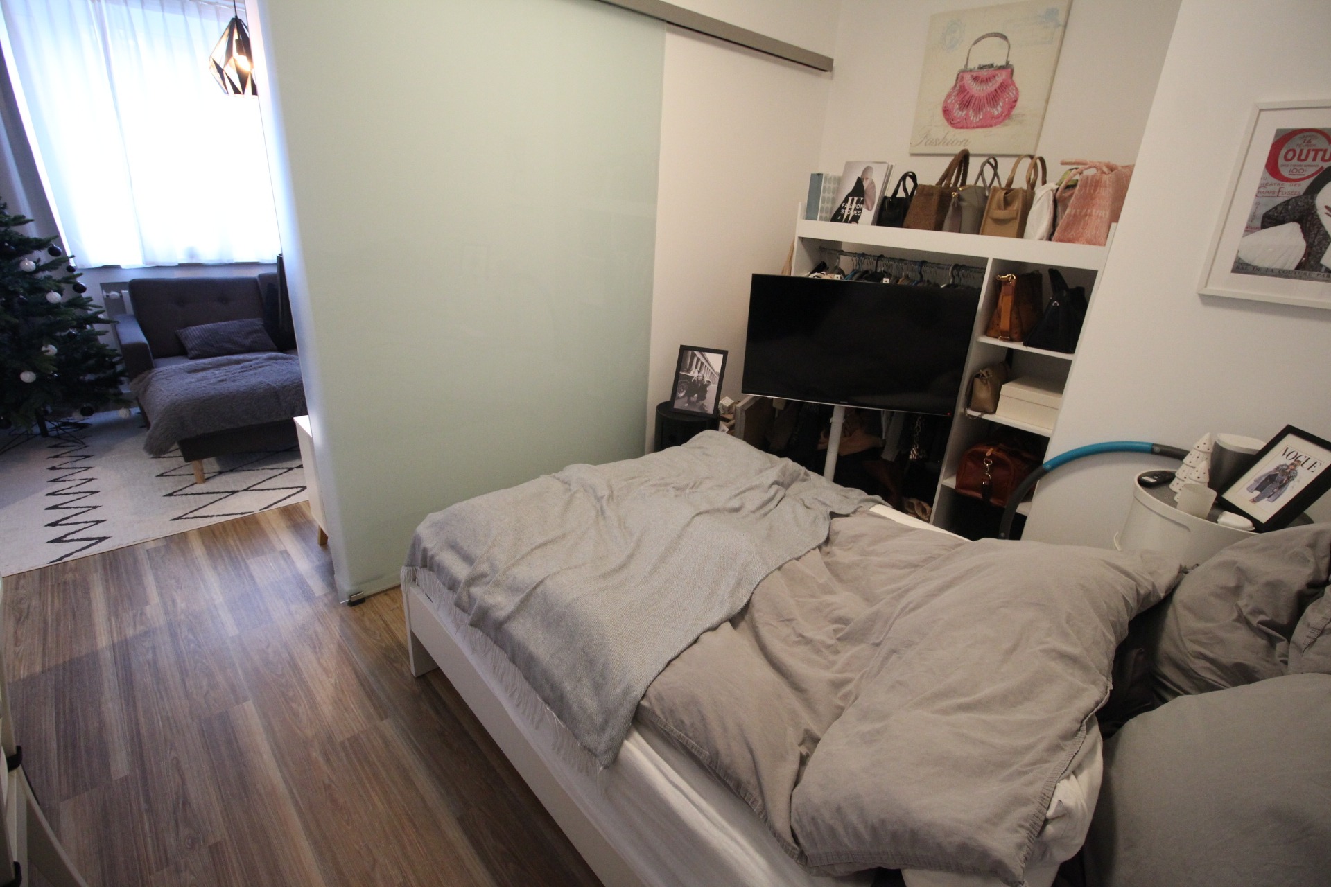 Der Wohnbereich ist offen gestaltet und schafft eine angenehme, einladende Atmosphäre. Das Schlafzimmer, welches über eine elegante Glasschiebetür abgetrennt ist, fügt sich stilvoll in das moderne Wohnkonzept ein.