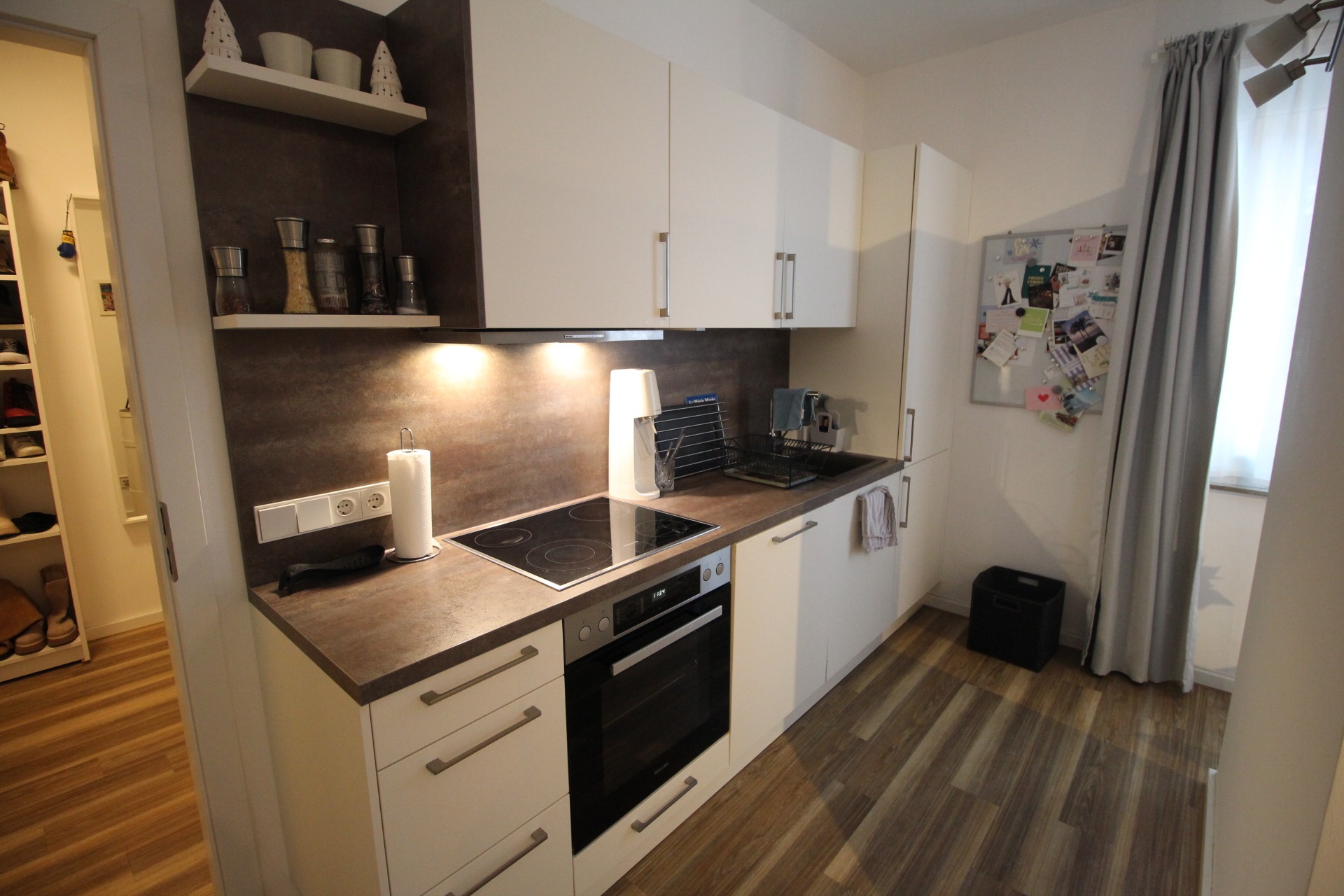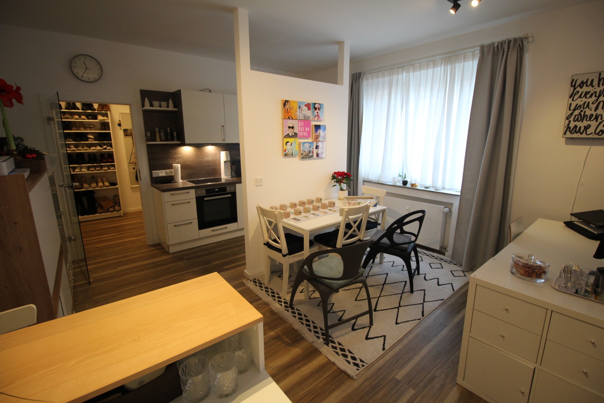 Diese moderne und helle Wohnung überzeugt durch ihren offenen und großzügigen Grundriss. Sie wurde 2021 komplett saniert. Die offene Küche ist mit einer hochwertigen MIELE-Einbauküche ausgestattet und bietet Ober- und Unterschränke, Herd, Backofen, Kühlschrank, Gefrierschrank, Spüle sowie eine Spülmaschine. Ein geräumiger Essbereich schließt sich harmonisch an.