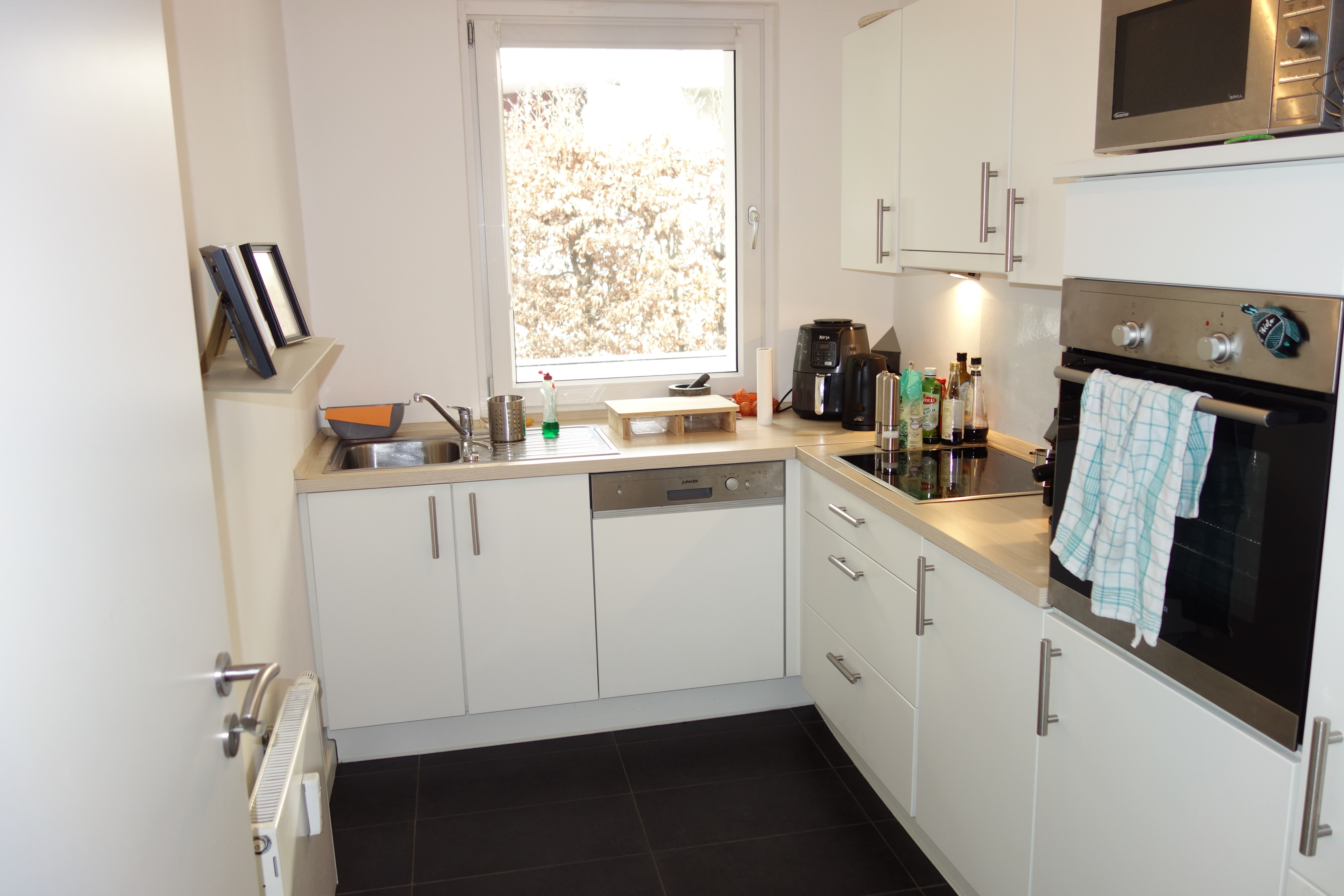 Es handelt sich hier um eine schön geschnittene und helle Wohnung im Erdgeschoss mit Balkon in ruhiger und "top" Wohnlage. Sowohl das Wohnzimmer als auch das Schlafzimmer sind mit modernem Parkettboden ausgestattet. Alle anderen Räumlichkeiten (Diele, Badezimmer, Küche) sind mit dunklen Bodenfliesen ausgestattet. Das helle Wohnzimmer zeigt nach vorne zur Straßenseite, hat jedoch einen kleinen Vorgarten sowie eine Mauer als Vorbau / Abschirmung direkt zum Gehweg. Das modernisierte Duschbad ist mit Spotlights und weißen Wandfliesen ausgestattet. In der Diele befindet sich eine Nische mit einem Waschmaschinenanschluss, wo die eigene Maschine aufgestellt werden kann. Die Küche ist mit einer modernen Einbauküche (Ober-/Unterschränke, Herd, Ofen, Dunstabzugshaube, Spüle, Spülmaschine, Kühlschrank) ausgestattet, welche in der Wohnung verbleibt. Vom Schlafzimmer aus gelangt man auf den nach hinten gerichteten Balkon.