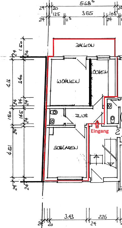 Gesamt: 2 Zimmer + Küche + Diele + Bad + Balkon = ca. 49,90 qm